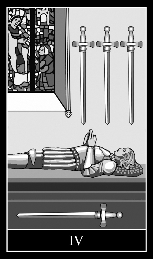 Общий визуальный ряд: персонаж карты в лежачем положении, это каменное изваяние на надгробной плите. Три меча прикреплены к стене, а четвертый расположился на самом гробу.