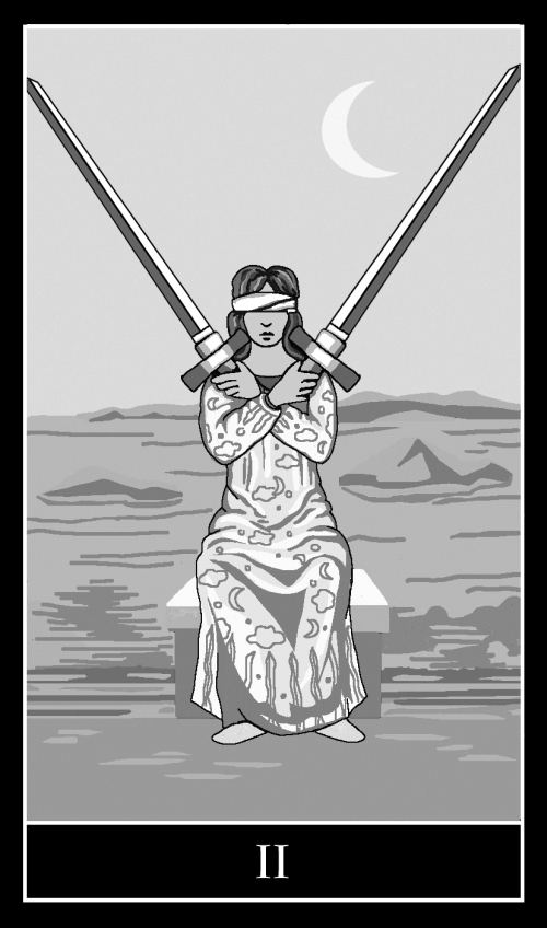 Двойка Мечей очень закрытая карта. На первом плане мы видим крест, на втором повязку, на третьем луну/ночь. Практически все в этой карте указывает на разного рода синонимы словам «нет, не надо, стой». Выпадая в раскладе, данный Аркан хочет сообщить человеку, что ему следует повременить с принятием решений, так как еще не время для этого. Обычно причиной тому является недостаток информации для объективной оценки ситуации.
