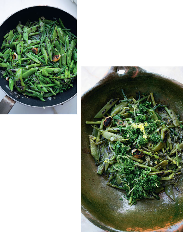 1. Поставьте на сильный огонь сотейник, для которого у вас есть крышка. Как только он задымится, добавьте четвертую часть фасоли обоих видов и готовьте около 5 минут, время от времени встряхивая сотейник, чтобы фасоль местами обуглилась. Выложите на противень или тарелку и обжарьте таким же образом остальную фасоль (если хотите ускорить процесс, используйте две сковороды). Добавьте чеснок и чили и готовьте таким же образом 34 минуты, пока они не почернеют со всех сторон, а потом выложите к фасоли. Дайте сотейнику слегка остыть.