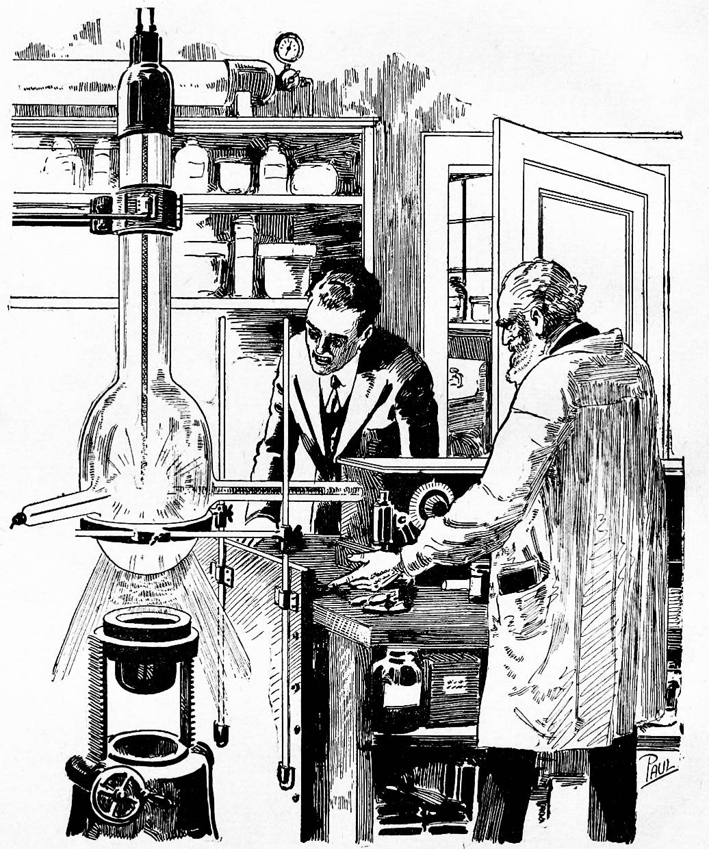 То, что я увидел, представляло собой очень большую и вытянутую рентгеновскую трубку, присоединенную к ртутному насосу. Она стояла вертикально, а на дне находился небольшой железный тигель с серебристой жидкостью, которая, как я предполагал, была ртутью. К аппарату был подсоединен кабель, который вел к коробке на конце стола, на котором лежала сама трубка. На одной стороне коробки находился циферблат, что придавало ей общий вид радиоприемника. Увидев все это, я обратился к профессору за объяснениями.
