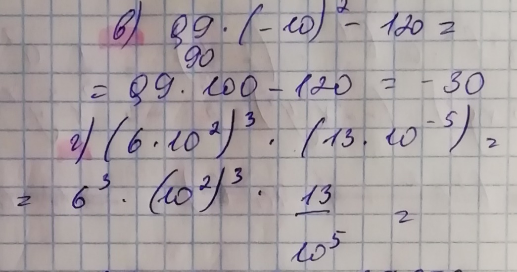 В) Сначала определимся со знаком, когда степень четная, то знак будет +, если нечетная, то (-). В данном случае степень четная, соответственно знак будет + при возведении в степень. (-10)² = 100. Далее 100 * 0,9, здесь не обязательно перемножать в столбик, достаточно посчитать сколько нулей у ста, а после запятую у числа 0,9 перенести вправо на количество знаков, в данном случае на два знака вперёд переносим запятую, получается 90. Далее вспоминаем как делать действия, если числа противоположные по знакам. 90-120, находим большее число и из большего вычитаем меньшее, ставя знак тот, который у большего числа. То есть 90 120 = (-30). У 120 знак минус, из него вычитаем 90 получаем число 30 и знак ставим тот, который у числа 120.