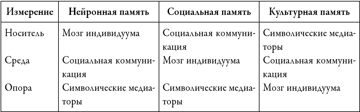 Память формируется взаимодействием трех факторов: носителя, среды и опоры. В случае с нейронной памятью носителем является человеческий организм и его мозг, средой социальное окружение и его рамки памяти, а опорой служат мемориальные стратегии (например, повторение или «анекдотизация») и медиальные записи. В случае с социальной памятью носителем является социальная группа, сплоченная общим, регулярно обновляемым ресурсом воспоминаний, средой оказываются отдельные индивидуумы, обменивающиеся индивидуальными вариантами общих воспоминаний, а опорой символические медиаторы, которыми пользуются эти индивидуумы. В случае с культурной памятью соотношение трех компонентов изменяется еще радикальнее; культурная память покоится на таком носителе, как передаваемые и воспроизводящиеся культурные объективации в виде символов, артефактов, медиаторов, практик и их институций, в которых индивидуумы, будучи существами смертными, сменяют друг друга, однако передача и традиции обеспечивают долгосрочную значимость этих объективаций. Средой культурной памяти служит группа, которая определяет свою идентичность с помощью данных символов, варьируя, обновляя и оживляя их состав; опорой культурной памяти являются отдельные индивидуумы, осваивающие данные символы и творчески использующие их.