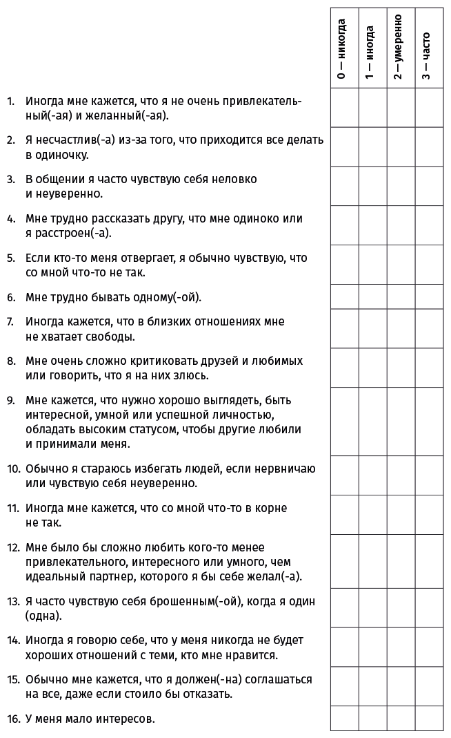 В этом тесте перечислены чувства, которые люди могут испытывать по отношению к себе и своим взаимоотношениям с другими. Отметьте, насколько часто вы испытываете описанное состояние. Если вы не уверены в ответе, выберите то, что вам ближе. Здесь нет правильных или неправильных ответов: руководствуйтесь тем, как вы обычно думаете и что чувствуете.