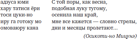 Здесь мы видим богатый спектр тропов. Адзуса юми («словно лук из древа катальпы») это макуракотоба, относящаяся к хару («весне»); хару какэкотоба, означающая одновременно «весна» и «натягивать» (лук); иру, что означает «стрелять из лука», служит энго к юми («луку»). Кроме того, здесь присутствует еще один чисто риторический прием эмфатическая частица кана в конце стихотворения.