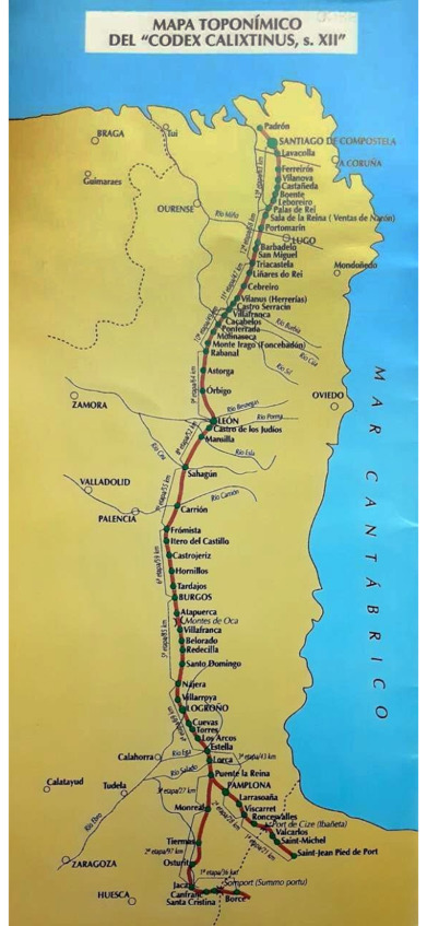 Традиционно имеется несколько стартов: если хочется пройти по всей северной Испании (по так называемой французской дороге: Camino Francés) (сверху вниз наискосок), то обычно начинают на границе с Францией в красочном горном посёлке Ронсесвальес (Roncesvalles). Самые отчаянные забираются ещё чуть выше в горы (уже на французской территории) и начинают свой путь в Сантьяго аж в Сан-Жан-Пье-де-Пор (т) в 28 км от Роснесвальеса. Следующий отправной крупный пункт Памплона (Pamplona). Потом из крупных следуют Логроньо (Logroño), Бургос (Burgos), Леон (León), Асторга (Astorga), Понферрада (Ponferrada). Последний крупный старт уже на территории Галисии: О Себрейро (O Cebreiro) 152 км от Сантьяго или для пешеходов = Саррия (Sarria) 112 км.