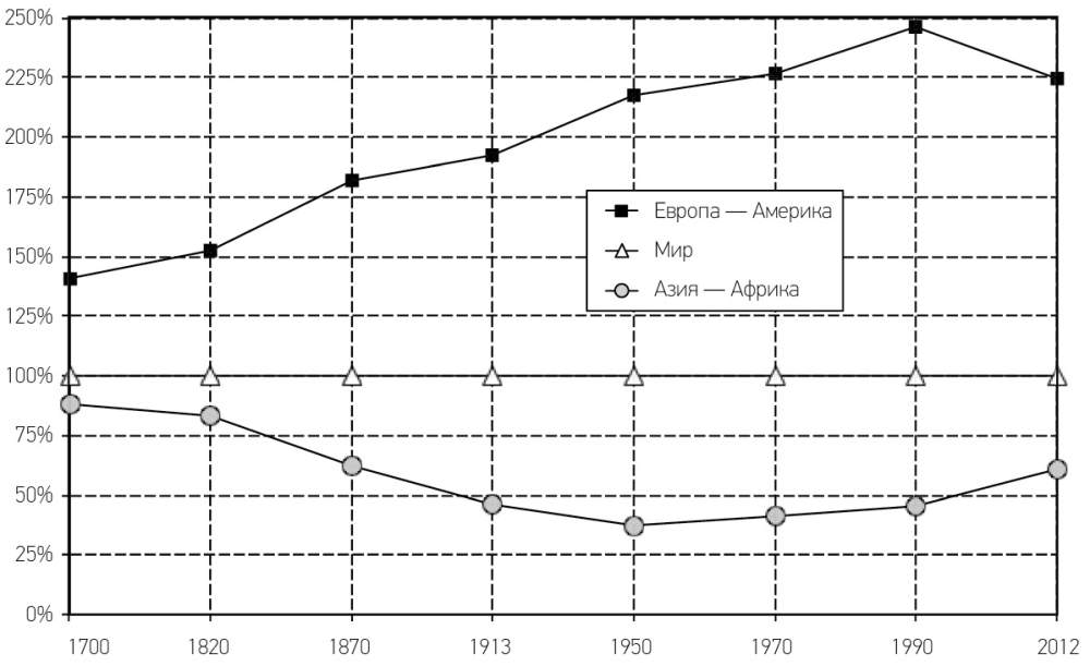 Примечание. ВВП в Азии и Африке выросло с 37 % от среднемирового в 1950 году до 61 % в 2012 году.