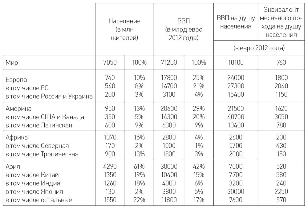 В Тропической Африке живет 900 миллионов человек, а ВВП составляет всего 1,8 триллиона евро (меньше, чем ВВП Франции, достигающий двух триллионов); это самый бедный экономический регион мира, где на душу населения приходится две тысячи евро. Индия ненамного превышает этот показатель, Северная Африка богаче, а Китай еще богаче: в 2012 году китайский ВВП на душу населения достигал восьми тысяч евро, что немногим меньше среднемирового уровня. В Японии ВВП на душу населения соответствует уровню самых богатых европейских стран (около тридцати тысяч евро), однако по отношению к остальной Азии ее население столь мало, что эти цифры никак не влияют на показатели азиатского континента, которые очень близки к китайским[61].
