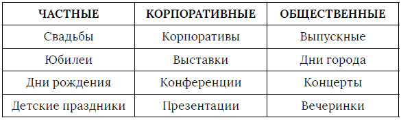 Видов мероприятий и праздников очень много. Мы рассмотрим основные, на которые чаще всего приглашают ведущих. Чтобы было удобнее ориентироваться, введём некоторую систематизацию, разделим мероприятия на 3 большие группы: