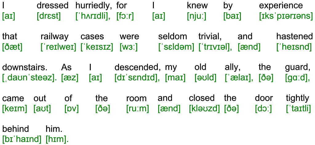 В данной книге приводится транскрипция текста рассказа А.К. Дойла «Палец инженера» на английском языке. Текст рассказа разбит на небольшие фрагменты. Фрагменты пронумерованы порядковыми номерами (01, 02,,60). После номера фрагмента приведены время начала и окончания аудиозаписи текста фрагмента в аудиокниге. Для каждого фрагмента подготовлена транскрипция текста, оформленная в виде иллюстраций с изображением транскрипции текста фрагмента.