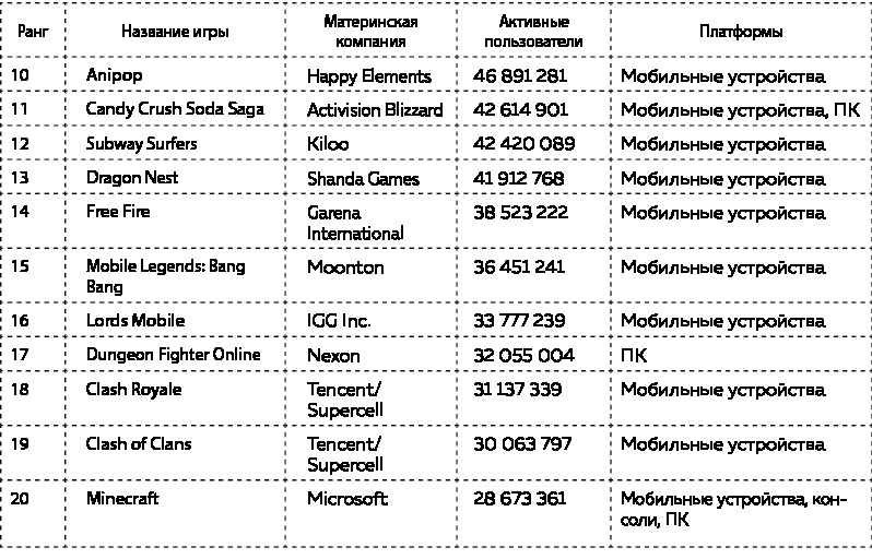 Примечание: Доход от игр определяется как весь доход, полученный от интерактивных развлечений, включая выпуск развлекательного программного обеспечения, продажу игровых консолей, доходы от микротранзакций, доход с подписок на платформы и доходы от рекламы. Поскольку у каждой компании своя бизнес-модель, очевидно, что их способы получения дохода тоже различаются. Как следствие, эти цифры не стоит сравнивать друг с другом, они скорее иллюстрируют влияние каждой компании на индустрию видеоигр. В правой части таблицы показаны главные категории устройств, на которых основана деятельность компаний.