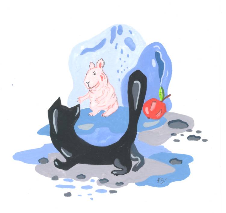 Девушка открыла клетку и потянулось рукой к Лысику. В этот моменту у зверка в голове промелькнуло куча мыслей и первая была мысль куснут больно за палец, потом вторая пищать так, чтобы всем стало страшно. А потом вдруг стало лень кусаться и пищать, он позволил взять его на руки. Руки у девушки были теплыми и приятными на запах. Она нежно погладила Лысика и стала ему рассказывать о себе. Потом отпустила на стол. Смотреть как он исследует новое пространство было забавным занятием. Любопытный зверек засунул нос везде и все понюхал, потом нашел ворох бумажек и стал лапками перебирать, шурша на весь дом. На звук запрыгнула на стол кошка.