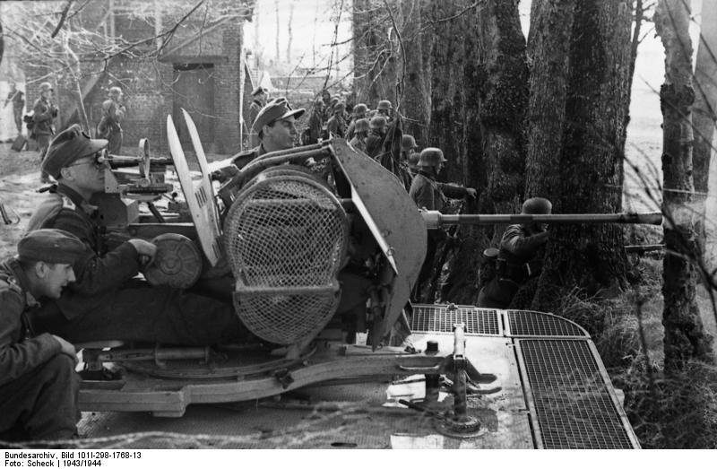 Flak 38 Курта Грюнберга жадно дожирал уже седьмой магазин, подносчик и заряжающий работали в максимальном темпе, а командир расчёта, обер-фельдфебель Петер Шульте, едва высовывая голову в каске из-за среза капонира, зорко следил за малейшими изменениями быстро меняющейся боевой обстановки.