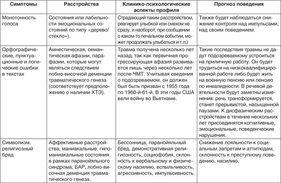 Необходимо понимать, что клинико-психологические аспекты в криминальном профилировании ни в коем случае не составляют основу какого-либо медицинского диагноза. Потому что для его постановки необходимо обследование самого индивида, а он, как мы понимаем, еще не задержан. Анализ всего спектра аномалий, которые очевидны профайлерам-психологам, основан на предположении о характере мнестических, эмоциональных, когнитивных, бихевиоральных нарушений, которые отражают характеристики определенных клинических синдромов и могут предоставить инструмент для идентификации и поимки неустановленного преступника.