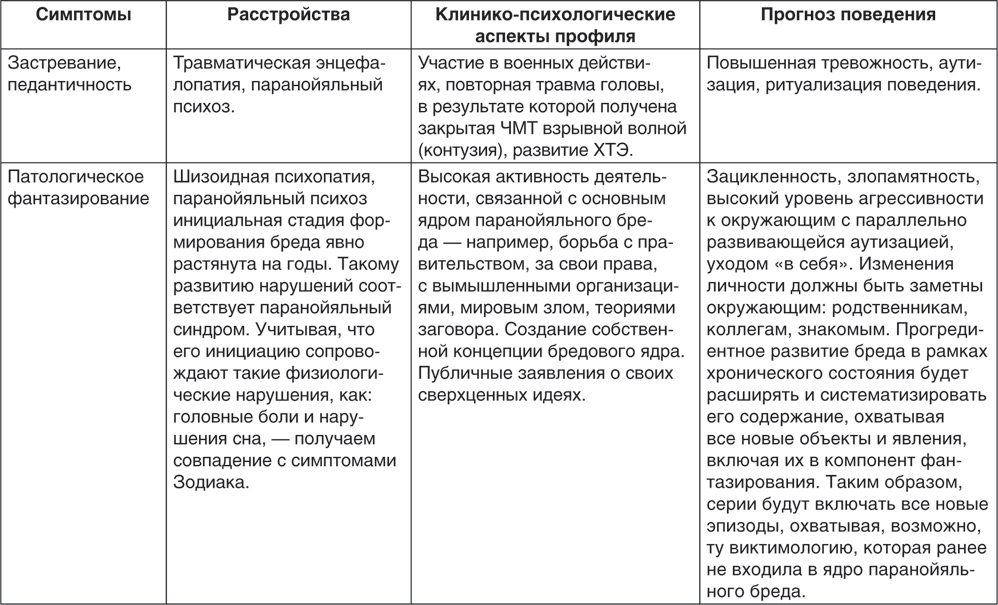 Попробуем предположить, какие версии можно было бы выдвинуть в отношении клинико-психологического состояния Зодиака, и вместе постараемся представить те характеристики, отличительные черты, которые, в связи с этим состоянием можно было бы внести в профиль. Возможный диагноз расстройство личности параноидного типа; расстройство личности паранойяльного типа; паранойяльная психопатия. Если данное предположение верно, то у Зодиака перед эпизодами должно было присутствовать бредовое настроение (предшествующее бреду состояние повышенной тревожности, предчувствие надвигающейся опасности/несчастья, которое обязательно произойдет, если он не исполнит определенный ритуал). Для наглядности сравнительного анализа клинических аспектов, на которые можно было бы опираться в случае с Зодиаком, авторами была составлена таблица (авторы просят учесть, что версий развития клинически обусловленных отклонений могло быть несколько. В данном примере представлена лишь одна версия, которая, по мнению авторов, логически укладывается в схему действий преступника и в тот профиль, который составлял Дж. Дуглас):