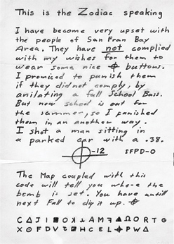 2) фантазирование (в письмах писал, что фантазировал ночами. Это письмо в полицейское управление Риверсайда, которое Зодиак отправил после убийства Чери Джо, буквально: «Она была молодой и красивой, но теперь она потеряна и мертва. Она не первая и не последняя Я лежал бодрясь ночьми, думая о моей следующей жертве» (орфография и пунктуация Зодиака сохранены)) шизоидная психопатия (малый интерес к сексуальному общению, элемент фантазирования носит аутистический характер фантазирование «про себя», с элементами интроспекции (погружения в свой собственный мир); паранойя «идеальный тип чисто бредового процесса»;[4]