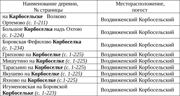 Таблица 2.1Топонимы Корбоселка/Карбоселка по «Переписной книге Водской пятины 1500 года»