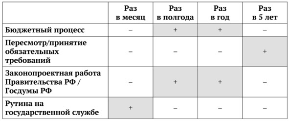 Необходимо всегда держать руку на пульсе и иметь в виду, что процессы в институтах власти и между ними протекают постоянно, пересекаясь друг с другом. Несколько ветвей власти часто одновременно работают над теми же вопросами, а внешние стороны постоянно пытаются повлиять на результат их работы. Поэтому наилучшим вариантом здесь будет найти потенциальные возможности участия в национальных и федеральных проектах, государственных программах, федеральной адресной инвестиционной программе12, проектах подведомственных организаций и институтов развития, так как это и есть внешнее проявление работы государственных институтов.
