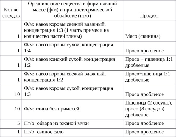 Всего было изготовлено 30 сосудов небольшого объема 100150 мл. Сосуды обжигались на костре. В первом эксперименте участвовало 24 сосуда, в 10 из них формовочная масса представляла собой глину без примесей, в 14 глину с примесью сухого или влажного навоза, добавленного в разных пропорциях (табл. 1). В ходе второго эксперимента сосуды, изготовленные из глины без специальных примесей, обрабатывались после обжига. Пять сосудов были обварены, а один обмазан свиным салом. Обвара была приготовлена из ржаной муки грубого помола в пропорции: 1 столовая ложка муки на 1 стакан воды. После обжига в костре каждый из пяти сосудов погружался на несколько секунд в теплую обвару и несколько раз там поворачивался. Для исходных материалов эксперимента учитывалось их географическое происхождение.