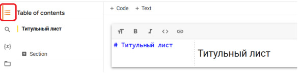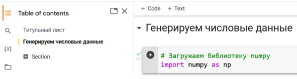 Создадим новый раздел и озаглавим его: «Генерируем числовые данные». Обратим внимание, что мы можем перемещаться между разделами документа с помощью оглавления. Мы также можем сворачивать и разворачивать разделы, нажимая кнопку слева от заголовка раздела, см. рис.
