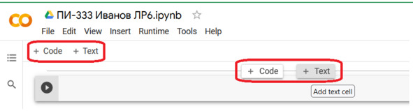 Блокнот состоит из ячеек, которые могут содержать программный код Code или текст Text. Для создания очередной ячейки нажимаем соответствующую кнопку, см. рис.