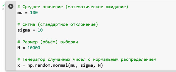 Теперь мы вызываем генератор случайных чисел и передаем ему параметры распределения и объем выборки, см. рис.
