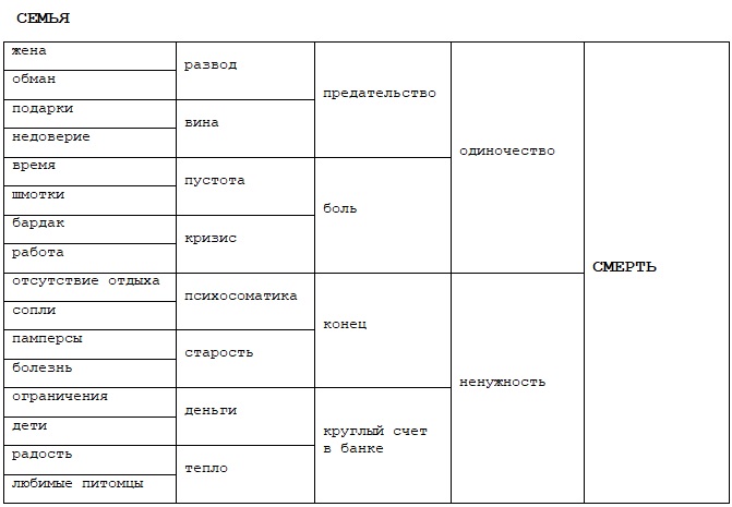 Короче, продолжил Лекс. Он выписывал 16 ассоциаций к слову «семья», затем объединял их по парам: первое со вторым, третье с четвертым, пятое с шестым и т.д. Получилось 8.
