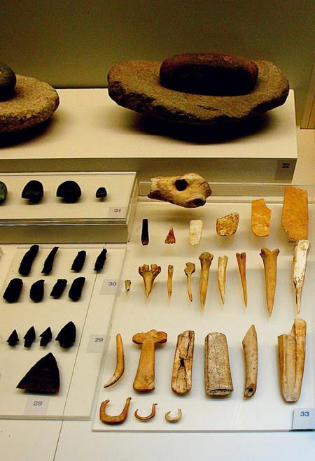 Обсидиановые и костяные орудия труда из пещеры Франхти. XVII тыс. до н. э.