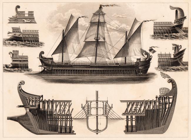 Изображение греческой пентеконторы, ее разрез, носовые части греческих и римских галер. Гравюра. XIX в.