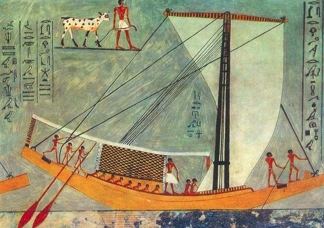 Суда, изображенные на египетской керамике конца четвертого тысячелетия, имеют низкий корпус в виде полумесяца с двумя кабинами на носу и на корме; несколько весел спереди и два на корме. Рисунки настолько стилизованы, что археологи вначале решили, будто это изгороди или клетки для содержания страусов! На более поздних документах (Древнее царство, 27802280 годы до нашей эры) суда изображены с большей четкостью: видно, что они построены из камыша и папируса. Позже вместо этих материалов стали использовать дерево.