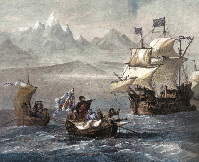 Экспедиция Магеллана входит в пролив, соединяющий два океана. Литография. 1880