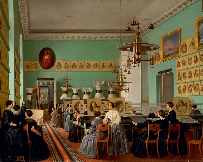 Как мы уже упоминали, в программу женского начального образования входили азы рисования. Благодаря популярности идей Джона Локка и Жан-Жака Руссо о ценности образования для всесторонней реализации гражданина, в высшем обществе распространилось представление о пользе рисования не ради совершенствования навыка, но для общего развития[77]. Так, с середины XVIII века основы изобразительной грамоты были введены во многих гимназиях[78]. Художественные дисциплины были также введены в учебный план институтов для женщин. В «Уставе народным училищам в Российской империи» 1786 года, Екатерина II утвердила программы, включающие курс рисования[79].