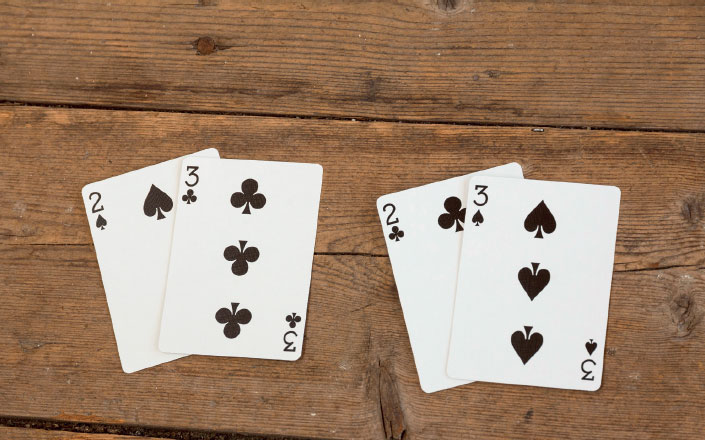 2. Возьмите из колоды две верхние карты (двойка пик и тройка треф). Покажите их зрителю и скажите: «Я вытащил две карты одна двойка и одна тройка трефовой и пиковой мастей. Можете подержать их». Протяните ему карты лицевой стороной вниз.