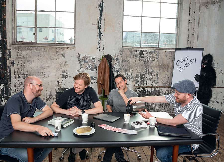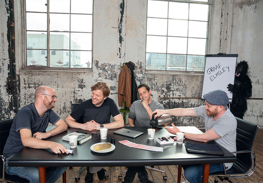 Слепота к изменениям лучше всего проявляется, когда вам дают определенную команду, например, запомнить игральную карту, но даже когда вас просят внимательно рассмотреть фотографию и заранее предупреждают, что на ней будут изменения, все равно их будет трудно заметить. Давайте проверим это еще раз. Внимательно посмотрите на этих четверых мужчин, ведущих оживленный разговор, и постарайтесь запомнить как можно больше деталей.