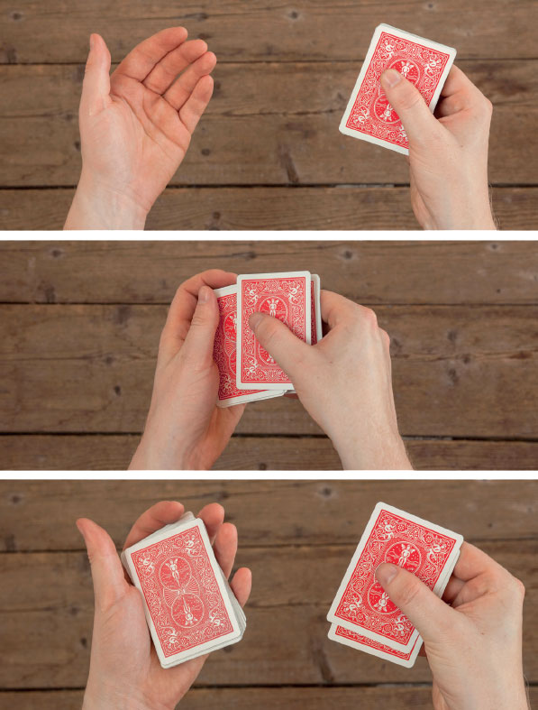 6. (Конечно, тут нужна сноровка, но все получится!) А теперь с широкой улыбкой переверните карты, которые вы все еще держите между большим и указательным пальцами. И вуаля! Как раз те карты, которые ваш испытуемый положил в середину колоды. По крайней мере, он так считает.