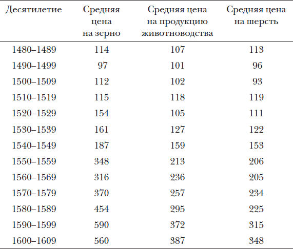 Изменение численности населения повысило спрос на сельскохозяйственные продукты, соответственно росли и цены. Этот процесс усугубили краткосрочные кризисы 15551559 и 15961598 годов (см. таблицу 2). В период после 15201529 годов выросли цены в целом и на зерновые в сравнении с ценами на шерсть.