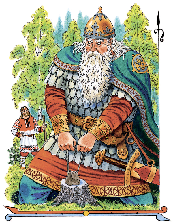 Зашёл Святогор в кузницу и видит: стоит у наковальни седой старичок, одной рукой меха раздувает, другой молотом по наковальне бьёт, а на наковальне-то не видно ничего