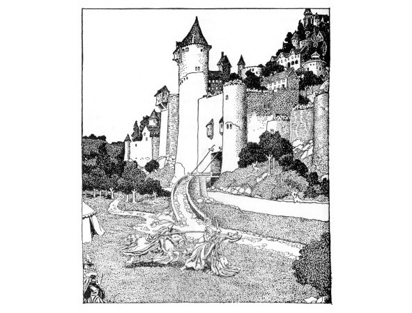 И там она сама увидела молодого рыцаря, когда он умывался у источника. И она увидела, что его волосы и борода сияли, как золото, в солнечном свете; и она увидела, что его нижняя одежда была из пурпурного льна, расшитого золотом; и она заметила, что рядом с ним лежал тот искусно сделанный золотое ожерелье, украшенное множеством драгоценных камней разных цветов, которое сияло с несказанным великолепием, лежа на мраморном краю фонтана.