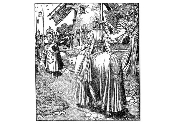 День был необычайно сладок и приятен для того, у кого такое крепкое телосложение и такое чуткое сердце, какие были у доброго короля Артура. Ибо яркие облака плавно плыли по голубому небу, а ветер трепал высокую траву на лугах и на полях растущей пшеницы, так что множество волн пробегало по холмам и долинам, как по целому морю зелени. И вот вся земля была прикрыта широкими тенями от этих облаков, как вдруг все внезапно вспыхивает в чудесном сиянии солнечного света. И маленькие птички весело пели в живых изгородях и в густых зарослях, как будто они готовы были разорвать свои крошечные глотки от пения, и петух с фермы кукарекал, сильно и громко, и все было так весело и мило, что молодой король, подняв забрало своего шлема, чтобы освежиться легким ветерком, иногда даже очень радостно напевал в этом своем путешествии. Так путешествовал король Артур в тот веселый и ласковый летний день, когда земля была еще молода, во времена, которые давно ушли в прошлое.