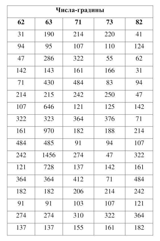 However, if we take the neighboring number 27, it will jump at a variety of heights, reaching the mark of 9,232, which, continuing the analogy, is higher than Mount Everest, but even this number is destined to collapse to the Ground, although it will take 111 steps to reach 1 and get stuck in the same loop. The same interesting numbers can be numbers 31, 41, 47, 54, 55, 62, 63, 71, 73, 82 and others. For comparison, we can analyze the table (Table 1) and the graph (Fig. 1) for these interesting numbers.