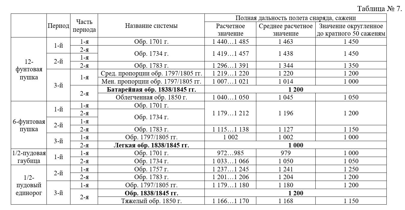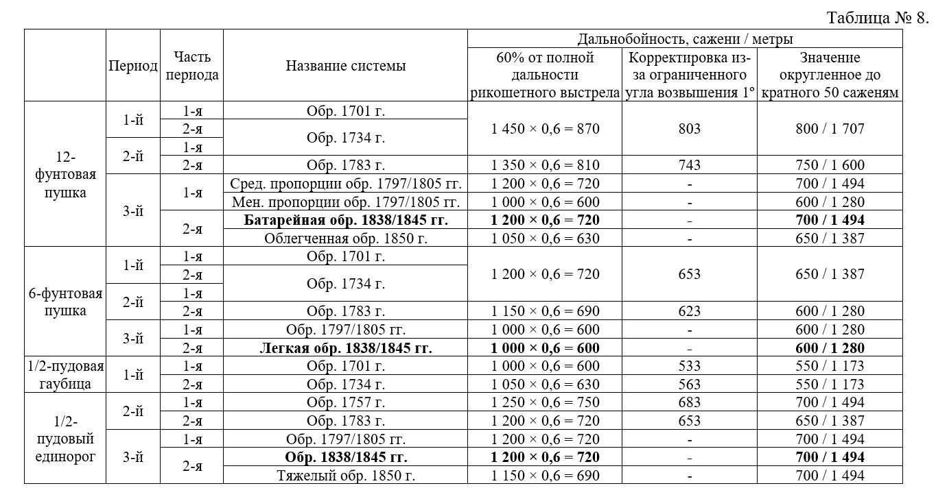 Для орудий системы обр. 1838/1845 гг. и 1850 г. на местности удобной для рикошетов (т.е. при угле возвышения 0º) «Руководство для артиллерийской службы» 1853 года определяло полные дальности настильно-рикошетной стрельбы из легких орудий до 1 000 саженей (2 133 метров), из батарейных до 1 200 саженей (2 560 метров). Взяв за основу эти данные, проведем приближенный расчет полных дальностей настильно-рикошетных выстрелов на благоприятной для этого местности по остальным артиллерийским системам на основе соотношения начальных скоростей снарядов одинаковых калибров (см. таблицу 7).