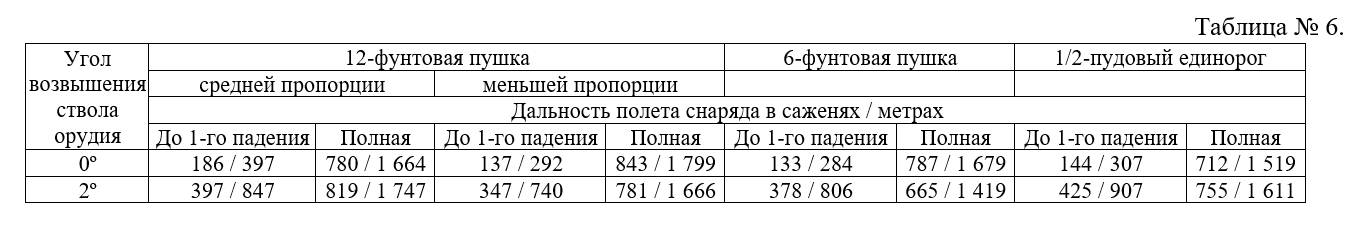 Анализируя сведения таблицы 6, можно предположить, что местность, где производились эти опыты, имела мягкий или рыхлый грунт, поскольку, во-первых, дальности полета ядер 12-фунтовой пушки меньшей пропорции и 6-фунтовой пушки при углах возвышения 2º оказались меньше, чем для возвышения 0º, и, во-вторых, полная дальность полета ядер калибром 12 фунтов для возвышения 0º у пушки меньшей пропорции оказалась больше, чем у пушки средней пропорции. Поэтому если бы стрельбы проводились на благоприятной местности, т.е. твердом и ровном грунте, то и дальность всего полета рикошетирующих снарядов возрастала по мере увеличения угла возвышения ствола, а полная дальность полета ядра 12-фунтовой пушки средней пропорции было бы дальше 12-фунтовой пушки меньшей пропорции при возвышении 0º за счет большей начальной скорости снаряда у первой.