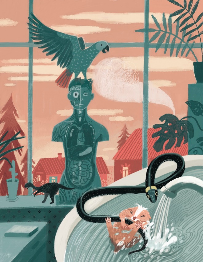 Но обитателям живого уголка легче от этого пока не стало. Авоськин без конца чихал, попугай нёс чепуху. Ужиха с мутными глазами и облезающей кожей дополняла послепотопную картину. Линька у неё началась из-за того, что она поранилась во время ночных приключений.