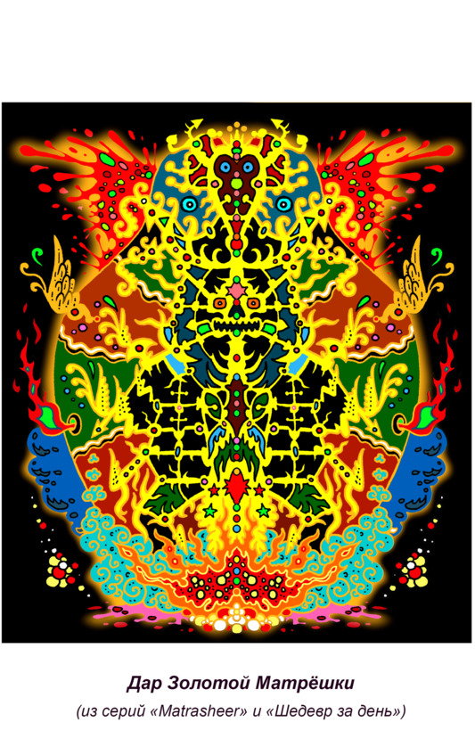 Называю такие вещи экспроментальной графикой, а она весьма энергозатратна, хотя и льётся песней. Верхний слой почти сутки тотального экспромта, без эскиза, сразу начисто. Вплавлены скрытые послания и девять ярусов постижения. Первый, традиционно, на поверхности очевиден и понятен почти всем. Восьмой доступен лишь жреческому сословию, представителей которого в наше сумрачное время именуют по-разному: социальными инженерами, дизайнерами жизни, серыми кардиналами, агентами закулисья и так далее. А некоторые так и вовсе разделяют данное сословие на две ветви, считая их представителей воплощением дуальности непримиримо сосуществующих сил, чей конфликт сродни балансированью ницшеанского канатного плясуна, образ которого ежесекундно отражают 95% человечества И ещё один уровень запасной. За гранью добра и зла. Это на случай тотального краха ньютоно-картезианской парадигмы.