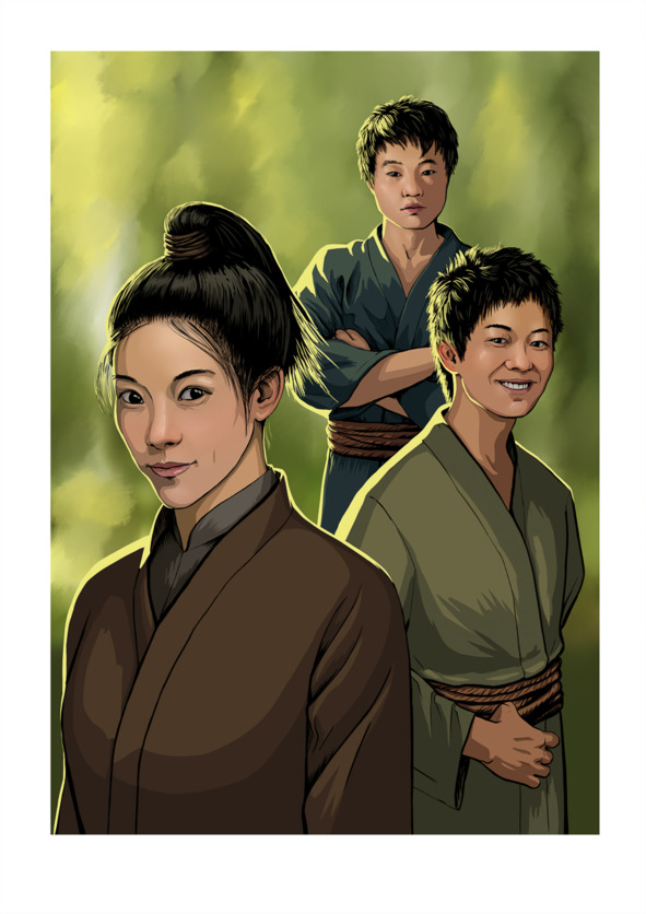 Далее парни-незнакомцы, один из которых оказался девушкой, быстро взяли Лин, Лана и Квана в оборот в ближайшей роще отобрали у них верхние шёлковые парадные одежды и безжалостно сожгли. А взамен выдали неопределённого цвета потёртые шаровары и рубахи, упругие сандалии из твёрдой соломы, конические шляпы, скрывающие лица, скатанные циновки, деревянные миски, короткие железные ножи и тяжёлые посохи из твёрдого коричневого дерева.