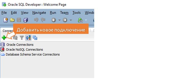 После распаковки архива с программой в удобный каталог, можно сразу запустить SQL Developer! При первом запуске, он установит необходимые настройки в операционную систему и сразу можно начинать пользоваться. После того, как SQL Developer полностью запустится, нужно создать новое подключение. Создав и сохранив новое подключение, далее будем его только выбирать, не нужно будет его больше настраивать. Для создания нового подключения, нажимаем кнопку как на рисунке ниже.