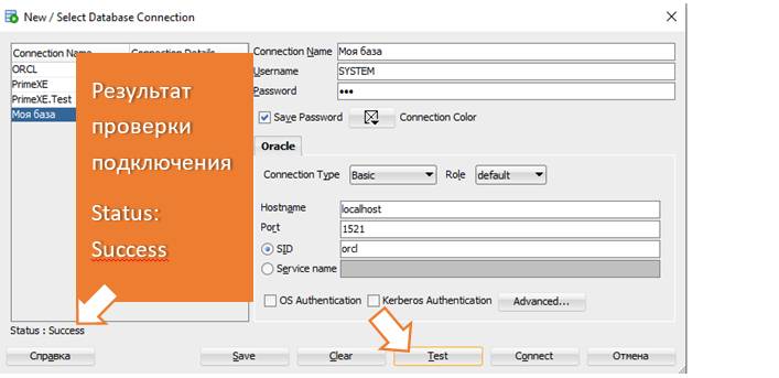 «SID» или «Service name» можно установить переключатель в любой из двух положений и указать имя базы данных, которое мы дали при установке. В нашем случае это «orcl».