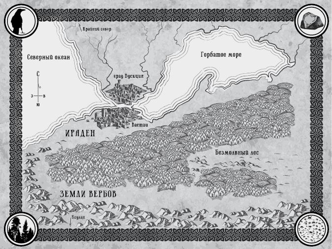 В нашу первую встречу ты выехал из леса, миновал высокие пучеглазые жертвенные столбы, отмечавшие лесную границу; твоя лошадь передвигалась шагом. Подле держался в седле небезызвестный мне Мават, высокий, широкоплечий; десятки длинных кос перехвачены сзади ободом с перьями золотой чеканки, темно-серый плащ подбит синим шелком. На предплечьях мерцают золотые обручи. Он рассеянно улыбался, что-то говорил тебе, однако взгляд его был прикован к крепости Вастаи на крохотном полуострове в двенадцати милях впереди двух- и трехэтажным постройкам, окруженным бледно-желтой стеной из известняка, чьи края смыкались на круглой башне у самого моря. По ее сухопутную сторону раскинулся городок, обнесенный земляным валом. Чайки носились над голыми мачтами редких кораблей в порту, над серыми волнами с барашками пены и белеющими вдали парусами. Через пролив едва виднелись белокаменные здания и многочисленные корабли града Вускции.