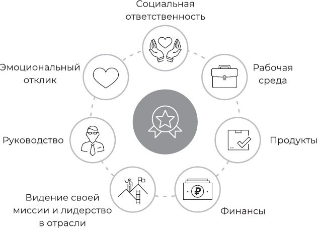 Видение своей миссии и лидерство в отрасли. Этот фактор характеризует «миссию» компании в глазах клиентов. Как клиенты понимают компанию, знают ли, к чему она стремится и что представляет собой сейчас? Воспринимают ли её как устаревшую, отставшую от трендов? Этот фактор тесно связан с лидерством в отрасли не только самой компании, но и ее руководства, потому что часто образ компании в сознании потребителей неразрывно связан с образом её руководства, лицом компании, которому общественность либо доверяет, либо нет.