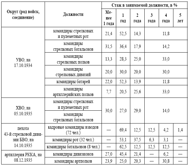 Стаж в занимаемой должности комсостава некоторых соединений, округов и родов войск в 19341935 гг.