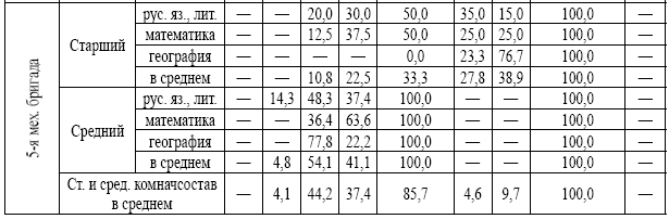 В ведомости, послужившей источником при составлении таблицы 3, нет данных по 4-й механизированной бригаде но из общего ряда не выбивалась и она. Одному заключению инспектировавших ее в марте 1935 г. работников 2-го отдела Штаба РККА («Тактическая подготовка слаба»), закономерно сопутствует другое: «Общеобразовательная подготовка неудовлетворительна». Правда, инспектировавшие видели причину слабости тактической выучки бригады в «отсутствии методических навыков у начсостава», но это отсутствие упиралось все в тот же недостаток общего образования. (О связи между тем и другим напоминали, например, составители годового отчета КВО от 11 октября 1935 г.: «В большинстве случаев еще далеко не достаточна общеобразовательная подготовка (а подчас и элементарная грамотность) младших командиров, а отсюда и трудность привития такому младшему командиру навыков по методике тактической подготовки»)